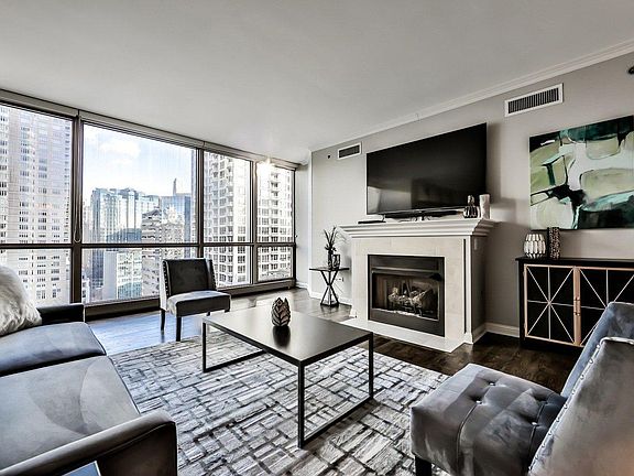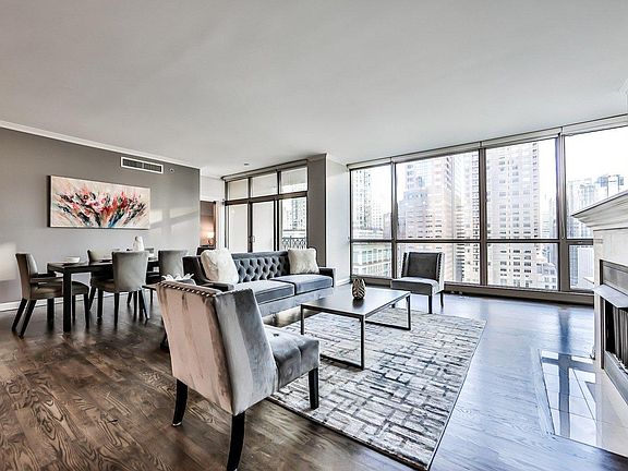 This 10th-floor Furnished condo for rent has INCREDIBLE breathtaking Chicago skyline and Lake Michigan views, two en suite bedrooms including a substantial primary suite with a walk-in closet and spacious bathroom. Beyond the spacious living room with hardwood floors, there is a chef's kitchen with a breakfast area, a separate dining room, and floor-to-ceiling windows with unobstructed Chicago views.
