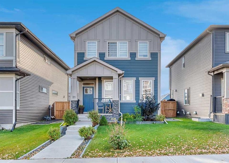 This is a warm and bright home at the doorstep of the Rockies in the sought-after D’arcy Ranch community. The open but sectioned layout allows you to maximize and personalize the space. Situated on a wide lot with breathtaking mountain views from the two bedrooms. The south-facing backyard and large windows provide all-day sun and natural light throughout. You are invited in by the cozy, covered porch and foyer, to the big and open main floor with 9-foot ceilings, living space, dining room, kitchen with a pantry, front and back closets, and tucked-away half-bath and mudroom. Sparkling quartz countertops, modern cabinets, and high-end stainless appliances create a clean and attractive kitchen space with a central oversized island. Upstairs is a large primary bedroom with a double-vanity ensuite and walk-in closet. Separating the primary from well-sized second and third bedrooms is a 4-piece bath and convenient upstairs laundry space. The basement features 9-foot ceilings, bathroom rough-in, egress window, and dedicated utility corner. At the back, you will find a nice sized deck, private yard, and large double parking space accessed from a paved alley. Upgrades include kitchen appliances, window coverings (blackout in bedrooms), luxury vinyl flooring, and fencing. D'arcy Ranch offers more than a better lifestyle. This community is the first to have a safe-route network separating pedestrian travel from major roads. Nearby are multiple highly rated schools, including a private school now taking applications, and a high school with well-recognised French, arts, and trades programs. There is direct access to HWY 2A to beat the rush to Calgary. The new and expansive shopping district is within walking distance. The scenic walking trail around the pond, free seasonal ice rink, multiple playgrounds, free fitness parks, and new pickle-ball courts are sure to keep you busy. Not to mention the 18-hole D'acry Ranch Golf Club out your back door.