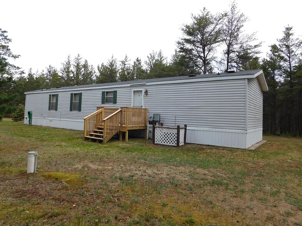 Pristine and well cared for mobile home out in a country setting. This square 10 acre parcel abuts state land. The primary bedroom is on one end and the two bedrooms and second bath is at the other end of the mobile. There is an elevated hunting blind on the property along with two sheds and a patio area. Easy to show!