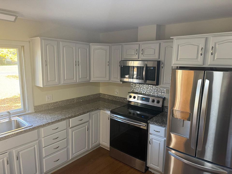 Modern kitchen with updated appliances, sleek countertops, and plenty of storage.