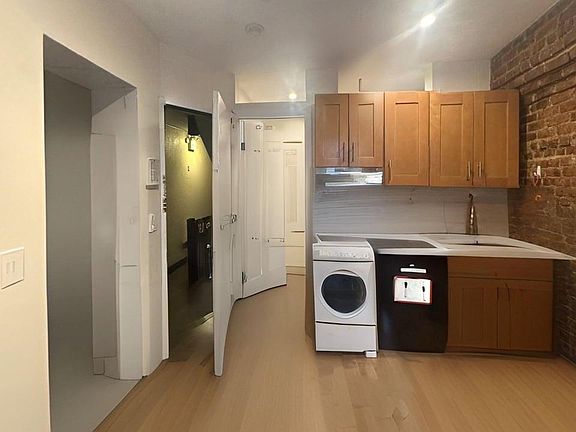 This is a walk-up and this unit faces Essex street. No laundry or dishwasher but there is a laundromat nearby.