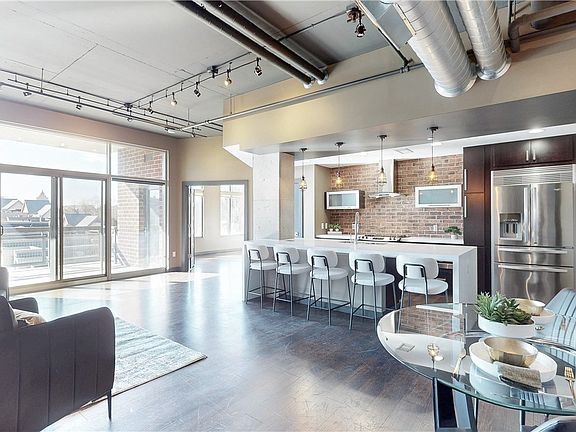 RARE UNIT WITH TAX ABATEMENT! Experience the perfect fusion of industrial architecture and contemporary elegance in this stunning 2-bedroom, 2-bath residence at Northside Lofts — one of downtown Akron’s premier urban addresses. Every inch of this modern loft captures the essence of elevated city living with dramatic design, rich textures, and thoughtful details. The chef-inspired kitchen features an oversized quartz waterfall island, brick accent wall, stainless steel appliances, and custom espresso cabinetry framed by stylish pendant lighting. The open-concept design flows seamlessly into the living and dining space, accented by a concrete column, high ceilings, and floor-to-ceiling windows that bathe the interior in natural light. The primary suite serves as a private retreat with exposed brick, a statement light fixture, and a spa-style en-suite bathroom featuring dual square vessel sinks, designer lighting, and a frameless glass shower with multi-jet system. A spacious second bedroom and full guest bath offer versatility for guests or a home office. Step through the glass doors to your private balcony and take in sweeping city views — the perfect backdrop for morning coffee or evening cocktails. Buyer must verify taxes.