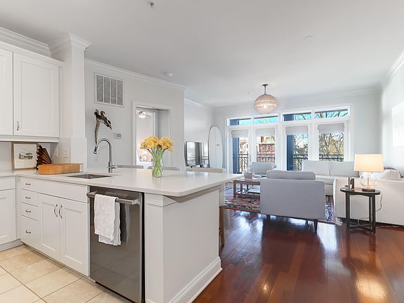 21 George features a wall of windows in the living room that bathe this 3rd floor flat with light creating an open feel with Charleston views beyond. Down the hall from entrance of this 2 BD, 2 BA condo has a community elevator that takes you from the gated parking area to the roof top deck with its views of church steeples and the Ravenel bridge. The well-appointed workout facility is located on the ground floor with the parking garage. With the above said, the interior of this condo is stunning. From walking into the entry and seeing the views across the living room to the private balcony there is a feeling of crisp style of this upscale condo. All of these amenities AND being located between King and Meeting in Charleston makes this a must-see downtown property.