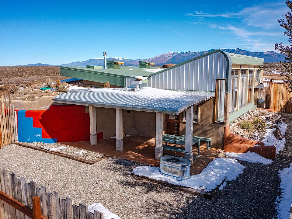 Gorgeous, upscale home with courtyard, neat patio, and natural landscaping. Solar Panels & high end, efficient energy system. Along with this beautiful home and 2.41 acres come 10 additional acres next door. This 10 Acres is OUT of the Greater World community, is under county zoning, and has very few restrictions. A meditation dome is conveniently located on this 10 acres. The dome is a spiritual touch perfect for any type of meditation, yoga or just hanging out. Great location and easy access, just 20 minutes from downtown Taos, and 30 minutes to Taos Ski Valley. The 360 degree views are amazing! Exceptional investment opportunity as these units will rent up to 200 - 250 days per year or MORE! Live well and be kind to the environment! Off-Grid living at its best! One of the finest Earthship Homes in the Greater World Community!