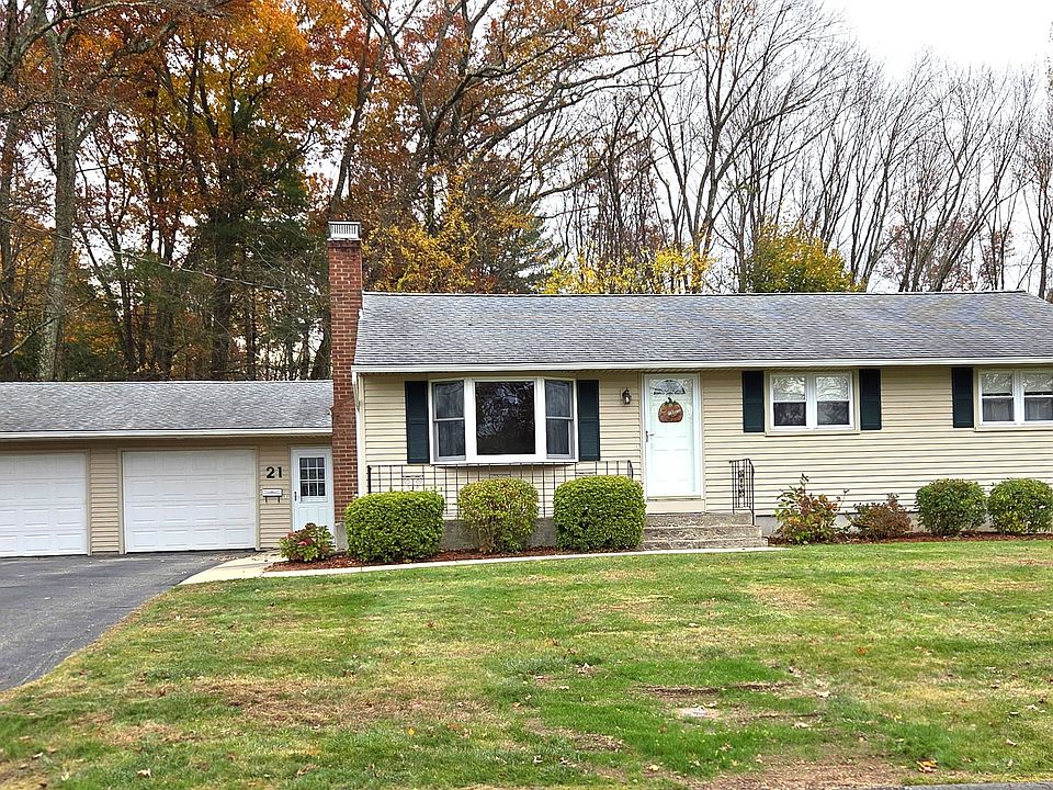 Welcome to 21 Grove Road! Step into this inviting 3 bedroom ranch-style home featuring a bright living room with a beautiful bay window, gleaming hardwood floor, and a cozy wood-burning fireplace to enjoy on chilly fall and winter evenings. The renovated kitchen opens to a spacious dining area-perfect for everyday living and entertaining. A large family room offers plenty of space for relaxing and provides easy access to the rear yard and a small covered patio, ideal for outdoor grilling and gatherings. The home includes three comfortable bedrooms, all with hardwood floors, combining comfort and classic charm. Enjoy the convenience of an attached oversized two-car garage with a large rear room perfect for storing lawn and garden tools or creating a workshop space. The partially finished lower level offers additional living or recreational space for your enjoyment. Updates include a new central air system (2023), new oil tank (2024) a 200-amp electrical service, vinyl siding, thermal windows, and added insulation, ensuring comfort and efficiency year-round. House roof replaced in 2011, garage roof in 2017. The home is also equipped with a central vac system. Located near parks, restaurants and shopping, with easy access to I-91, this home combines suburban charm with everyday convenience. Don't miss the chance to make this home your own!
