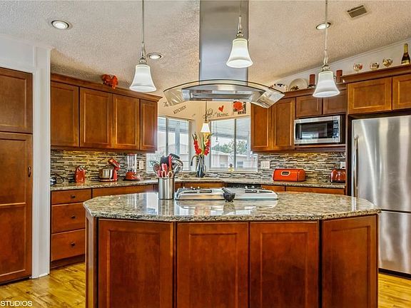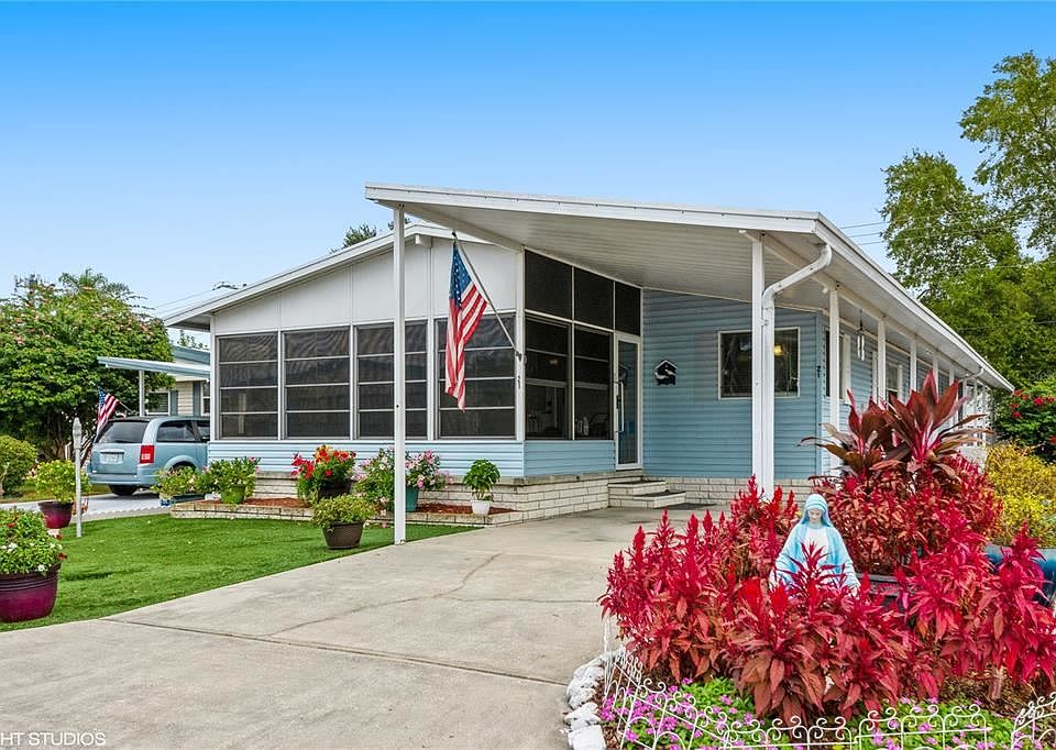Just listed in Gull-Aire Village. Excellent value! Spacious Jacobsen with 1612 square feet. Two bedrooms plus den. Open floor plan with cathedral ceilings. Newer, beautiful Chef's kitchen with quality cabinets and granite countertops. Stainless steel appliances with gas stove. Home also has gas hot water heater. Lovely, updated master bath with custom storage cabinets. Large inside laundry room. Bonus room is perfect for extra refrigerator and storage. Front porch enclosed with newer vinyl windows. Utility shed on back of home. Front yard has "Astro Turf." Gull-Aire Village is an active 55+ community and offers clubhouse, library, shuffleboard, Bocce ball court, and large heated pool & spa. Golf cart friendly. HOA is $50.00 per month. One pet-any size. You own your own land. You can walk to AMC Theatres, Beall's, Marshall's, Pet Smart and Dollar Store. Restaurants within walking distance include Shaker and Peel, Craft Street Kitchen, Mandola's and Eve's Family Restaurant. Just minutes to Westfield Mall, Walmart, Publix, and Countryside Hospital. About 20 minutes to the beautiful beaches of Honeymoon Island and Caladesi State Parks. Room sizes are approximate.