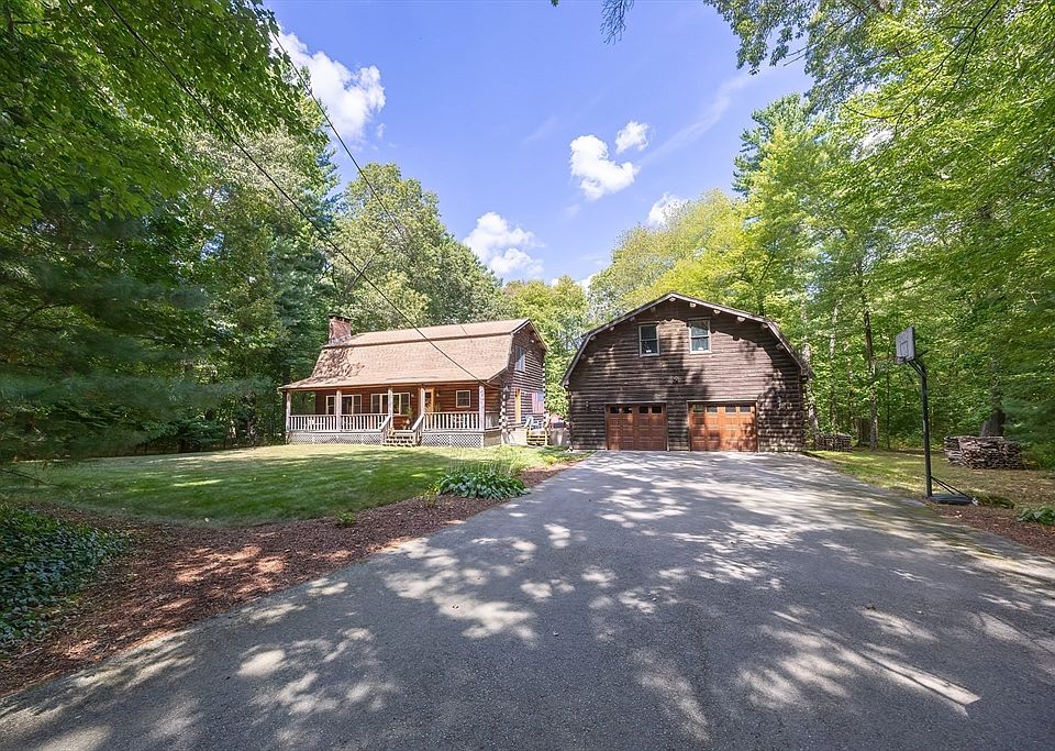 Price Improved—Motivated Sellers! Escape to this stunning log home on 4.4 acres of serenity! Relax on the front porch or entertain inside under soaring 20’ vaulted ceilings with a stone hearth and efficient wood stove. The first floor offers an updated kitchen that opens to the dining and living rooms, a full bath, and a bonus room for an office, gym, or guest room. Upstairs features 3 large bedrooms and a bright landing overlooking the great room. Outdoors, enjoy your deck, sparkling inground pool, and detached oversized 2+ car garage with expansion potential overhead. Unbeatable location - a short walk to Wentworth Hills Golf Club, and just minutes to the Wrentham Outlets, the Franklin train station, Gillette Stadium, and only 40 minutes to Boston or Providence! A rare opportunity to own a private retreat with rustic charm, modern updates, and an unbeatable location!