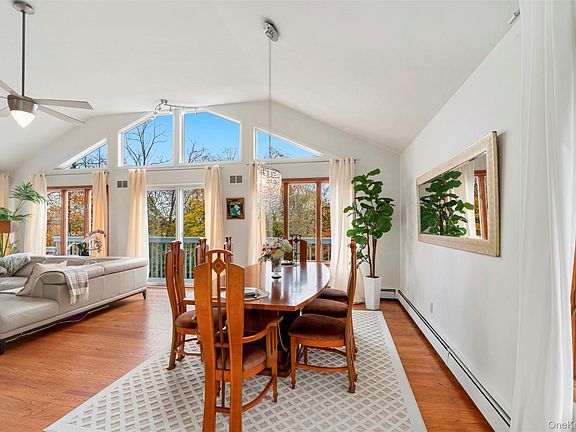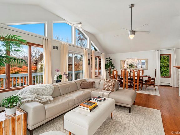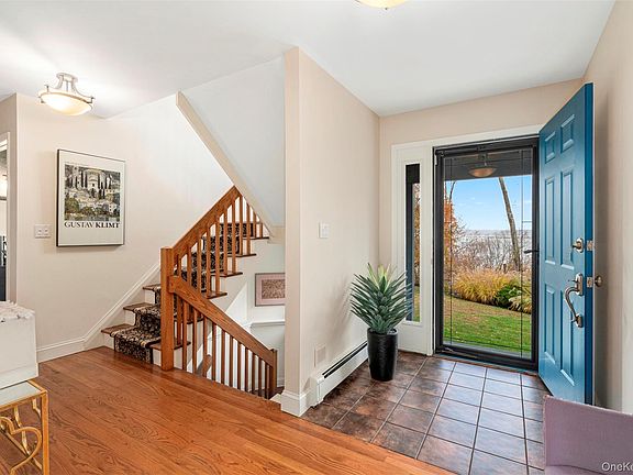 Welcome home to STUNNING Hudson River views from this well-designed Piermont Contemporary. Located in a peaceful setting above the charming village of Piermont, this 3-BR, 2.5 BA home is only 17 miles from NYC and steps from shops, chic restaurants & the waterfront. With its hillside location and upside-down design, the house is perfectly sited to take full advantage of the Outstanding riverside panorama. The 2nd floor’s open-concept Great Room features soaring ceilings and deck access. Step outside onto the wrap-around deck for a front row seat to one of New York’s best treasures – the incomparable Hudson River with views extending to the Mario Cuomo Bridge and Westchester County. The Great Room’s wall of windows bring those views and abundant light into the open-concept space which includes a large, comfortable dining room and wood-burning fireplace. The kitchen is adjacent to the dining area and features stainless steel appliances, granite counters, generous cabinetry, slate flooring & breakfast bar. A powder room completes the upstairs layout. Downstairs, the well-sized Primary Bedroom has an en suite marble bath. There are two additional bedrooms on this level and another full bathroom, featuring beautiful slate tiling. A 2-car garage, covered front porch, wrap-around upper deck, and front & back yards completes the offering. To immerse yourself in the area's natural beauty step outside your front door to the nearby Old Erie Walking Path which follows the Hudson's western shore. Convenient to the Palisades Parkway, 21 Hartz Terrace is just 22 minutes from the GW Bridge. For added convenience, the NYC bus leaves directly from the Village. This fall, start enjoying 'life on the river' in this distinctive Piermont Contemporary.