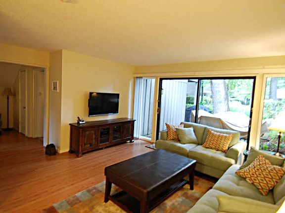 This is an exciting, 3 bedroom, plus bonus bedroom, 4 full bath villa at Water Oak Villas that directly looks out at the pool. This villa is centrally located inside the North Gate of the Palmetto Dunes Oceanfront Resort and is ½ mile to the water's edge. This villa has been beautifully decorated and wonderfully updated to include granite counter tops, new wood floor, new carpets, all new furniture and multiple wall mounted flat screen TV's in every bedroom. The living, dining and kitchen flow from one area to the next producing one large great room. The living area offers a suede sleeper sofa and matching love seat centered on the large flat screen TV. A leather coffee table with built-in serving trays sits upon a more modern area rug. Two black wood and glass circular end tables add to the modern ambiance. Sliding glass doors provide a great view of the pool. Stepping out onto the patio, you are offered a large outdoor table, six chairs and a gas grill. There is a full bath just off the living room that has granite counter tops and shower. The kitchen has been beautifully remodeled with granite counter tops, new light beige cabinets and all stainless steel appliances. The dining area offers a white and stained burled wood dining table with six matching chairs. The master bedroom on this floor offers a king bed with matching headboard, chest and end tables and new carpet. Next to the mirrored chest is a wall mounted flat screen TV. The private bath has a combination shower and tub. Sliding glass doors provide access to the patio and views of the pool. Completing this floor is the laundry room with side by side washer and dryer. Up the stairs on the second floor you will come to the second bedroom large enough for two double beds. A sliding glass door leads a private balcony that provides a great view of the entire pool area. There is a combination shower and tub in your private bath. The next bedroom also offers two double beds, private bath with shower and tub, and another private balcony. Each bedroom has a wall mounted flat screen TV. The bonus room on this floor is a small room with a wall mounted flat screen TV. Completing this floor is a stylish sitting area with two chairs, lamp and end table at the top of the stairs' landing.
