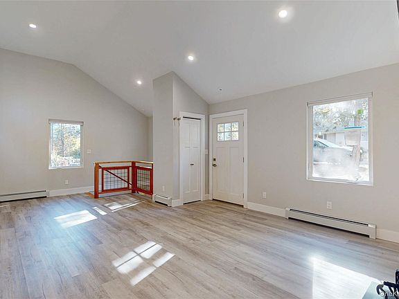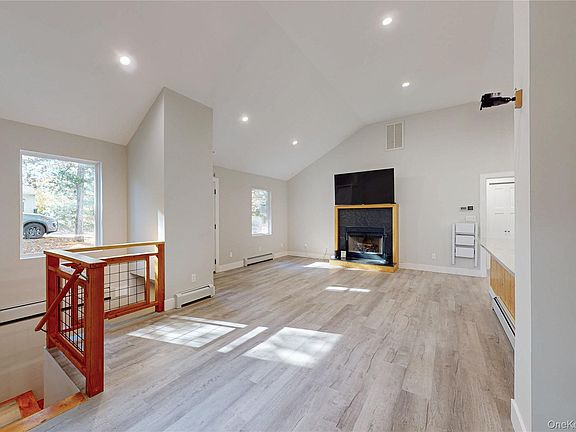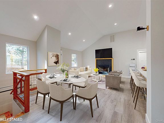 This beautifully updated contemporary ranch home is a year-round retreat in the private community of Twin Lakes where you can relax while enjoying the lake which is right down the road and everything else the Hudson Valley offers. Go swimming, boating and fishing in summer or venturing across the frozen lake in winter, leaf peeping and apple picking in fall, and exploring hiking trails and cultural landmarks anytime. You enter into a generous Living Room/Dining Area with vaulted ceilings and a raised hearth wood burning fireplace, which flows into the open design modern kitchen with breakfast bar, new cabinetry, stainless appliances including a pot filler, quartz counters, and a walk-in pantry. The lovely private primary suite which is accessed through a pocket door features a custom walk-in closet with built-ins, slider to a private terrace, and brand new modern bath with dual sinks and a rainfall shower/tub completes the first floor. Downstairs there are 2 additional bedrooms and a full bathroom which is a mirror image of the upstairs bath, a large family room with door to patio and yard, a laundry/utility room, an additional entry off a pretty covered veranda, and a one car garage. Luxury laminate flooring throughout. All set on a corner lot with flowering plantings, trees, and level lawn. The home was renovated from top to bottom over the past 3.5 years including: central AC, brand new heat pump, new roof, new siding, new windows and doors, and entire interior tastefully redone to satisfy the needs of a discerning buyer. Perfect location just minutes to the charming villages of Rhinebeck which boasts the oldest functioning inn in the country, or Red Hook and Tivoli which also offer lots of dining choices and shopping. Short distance to Hudson known for its historic architecture, vibrant arts scene, and walkable downtown. Close to the Taconic Parkway and Rhinecliff Amtrak station. Come see, will not last!