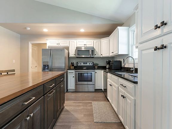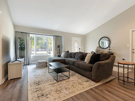 Inside, the main living area features an open layout with a vaulted ceiling, creating a bright and spacious feel throughout the heart of the home. The property was thoughtfully renovated in 2021, including fresh paint, updated flooring, fully remodeled bathrooms, and a new back deck that leads to a paver patio with fire pit, ideal for relaxing or entertaining.