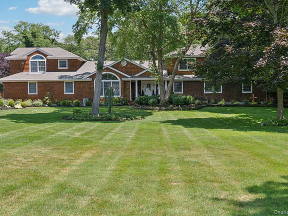 Welcome to 21 Inlet View Path—set on nearly two acres in the desirable Baywoods Estates, this idyllic property offers space, privacy, and stylish updates! Offering 5-6 bedrooms, 4 full bathrooms, 2 half-baths and 4000 +|- SF of living space. Thoughtfully & tastefully designed, the main level features a brand new gourmet chef's kitchen with Sub-zero fridge and Wolf induction stove, dramatic living room with a 20-foot ceiling and a wall of windows and a formal dining room. The main floor also features 4 bedrooms, laundry room, renovated bathrooms, custom mill work, shiplap detailing and textured wallpaper completing the first floor. Upstairs, is a spacious primary suite with a walk-in closet, luxurious bath and a balcony with beautiful views. There's a wonderful office or bonus room built above the attached 2-car garage. The basement is extremely large, partially finished and has brand new mechanicals(boiler, Hw heaters & central air). Step outside, enjoy your heated in-ground pool, pavers, remarkable pool house with cedar roof/full bathroom & washer/dryer, basketball-pickelball-tennis court and all new irrigation. 21 Inlet View Path offers the very best in convenience and a gracious lifestyle!