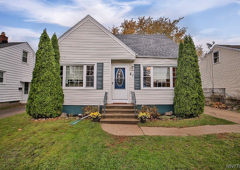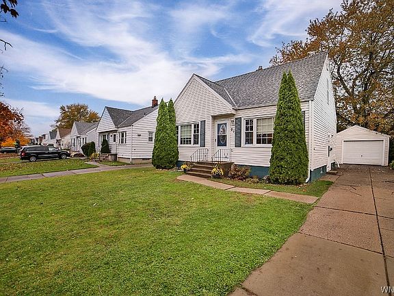 Desirable 3 bedroom, 2 full bath, freshly painted and newly carpeted Cape Cod awaits you! Located on a tree lined neighborhood street in Kenmore, this home offers a new rear concrete patio, partially fenced yard and a 1.5 car garage. Enter to find a spacious formal dining and living room area with gleaming floors and crown moldings throughout. The updated eat-in cherry kitchen offers plenty of counter space. 1st floor bedroom is adjacent to the 1st floor full bath. No clip ceilings in this upstairs rear dormer with an oversized updated bath with two sinks and large vanity area. Both baths have ceramic tile surrounds and tubs! Newer 6-panel upper doors. 2nd floor full bath is accessible to both bedrooms. Clean quality basement! Updates include newer windows with grilles between glass, maintenance free exterior with vinyl siding, newer exterior doors, updated electric service, furnace and central AC, roof '13, dishwasher 9-2023, HWT 2015. Must see home! Open Sunday 11/5, 11-1pm. Offers due November 10th, 1 pm.