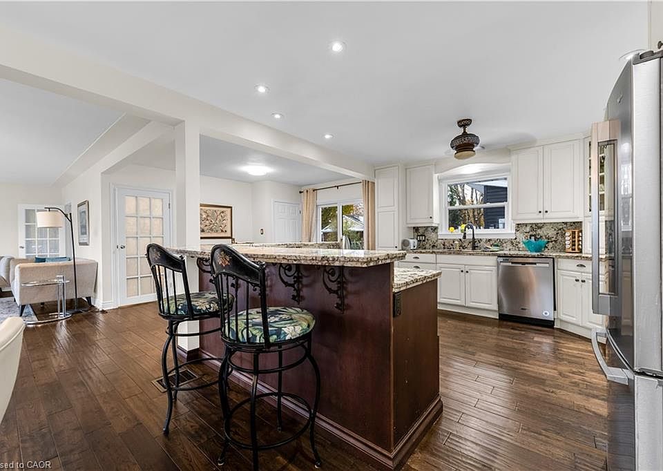 This special property is truly one of a kind. Uniquely situated, it offers the best views in town NOT on the water. Sitting on your front porch or simply walking out your front door, you and your guests are greeted with the tranquil serenade of the gentle waves of Lake Ontario. This bungalow is perfect for families of all ages, both younger and older, with modern attributes such as updated open concept kitchen, powder room, 4 piece bathroom and main floor laundry creatively nestled in the centre of the home amongst the 3 main floor bedrooms. The basement features a kichenette, 3 piece bath and a gas fireplace for relaxation, or for teen / in-law retreat. Many big ticket updates have been completed including 200 amp service (2023), roof (2022), furnace & heat pump (2023), stove (2025), dishwasher (2022), washer/dryer (2021), convenient kitchen organizers and pull outs (2021). The fully fenced back yard is family ready AND pool sized with incredible 3 season, heated and cooled, bunkie, flex space to explore. Lakeside drive is one of the most peaceful, serene streets in Grimsby and a favourite walking destination for locals. This one of a kind home is ready to move in and enjoy life by the shores of Lake Ontario.