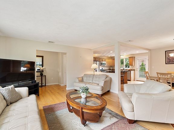 Welcome to this magnificent ranch-style home, situated in one of Saugus’ sought-after neighborhoods. Surrounded by mature landscaping & privacy, this well-maintained property is ideal for summer enjoyment & year-round comfort. From the horseshoe driveway, walk up granite front steps into a welcoming foyer featuring HW floors. The open-concept main level with HW floors, has a renovated kitchen w/SS appliance, granite island w/ample storage & access to a deck perfect for cookouts. Adjacent to the kitchen, a charming DR w/a built-in hutch flows seamlessly into the spacious fire-placed LR, with a large bay window. The main bedroom features a tiled en-suite bath w/walk-in shower. Two add’l bedrooms offer double closets & share a full bath. The sunroom is the perfect spot to relax on warm days & has direct access to the oversized garage. The finished lower level features a generous family room w/a striking stone fireplace, recessed lighting, a laundry area with vanity sink, half bath & more!