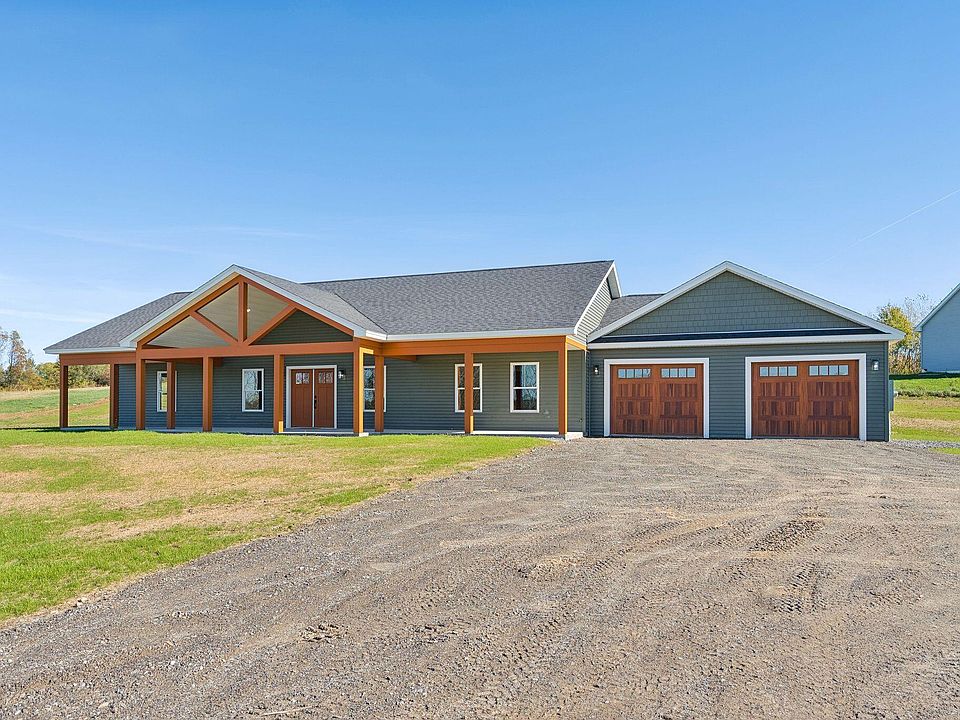 Welcome to this Brand new, custom ranch-style model home in Sidney- where timeless design meets low-maintenance, single-level living. Thoughtfully crafted with timber accents and an open-concept floor plan, the home features a striking navy island, quartz countertops, and high-end finishes throughout.
