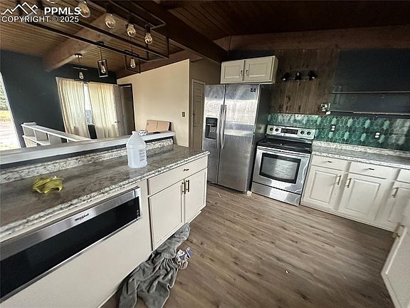Come see this updated 4-bedroom, 2-bath ranch-style home, ideally located just a 5-minute drive from Fort Carson—perfect for military families or anyone seeking convenience to the base, I-25, shopping, and schools. Recent upgrades include fresh interior and exterior paint, fully remodeled bathrooms with modern fixtures and finishes, and a bright, open-concept living area featuring sleek stainless steel appliances. You’ll love the stunning wood beam ceilings and expansive floor-to-ceiling windows that flood the home with natural light and showcase panoramic views of Cheyenne Mountain. Step out onto the spacious wrap-around deck—perfect for morning coffee, evening barbecues, or simply enjoying Colorado’s beautiful weather and those incredible mountain vistas. Situated on a massive ¼-acre corner lot (over 10,000 sq ft!), there’s plenty of room for RV parking, boats, toys, or future expansion. The yard is fully fenced and divided into two separate areas—ideal for pets, kids, gardening, or extra privacy. Stay comfortable year-round with central air conditioning, and take advantage of the huge unfinished lower-level room with walk-out access—ready to become your dream workshop, home gym, extra storage, or even future living space. This gem combines classic ranch charm with modern updates and unbeatable outdoor living. Schedule your showing today—this one won’t last long!