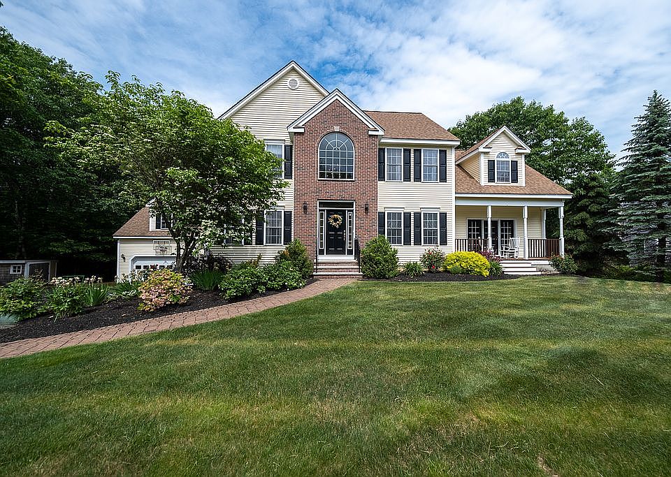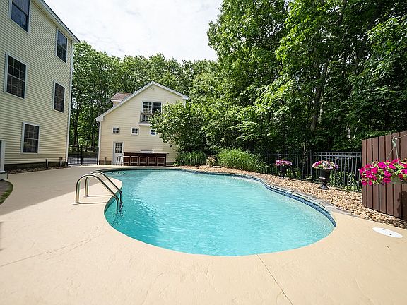 CASTLE REACH - Step inside this luxury home to a grand two-story entrance with custom office on either side. The first floor remodeled kitchen/great room area includes a large granite island with matching table, custom cabinets with abundant storage, stainless steel appliances, fireplace and extensive woodworking & hardwood flooring throughout - all leading to an expansive deck. An elegant dining room finishes off the first floor. The second floor boasts 3 spacious bedrooms and an oversized master bedroom suite with double closets and built-in bureaus, a brand new master bath with sliding barn door, gorgeous marble shower, free standing tub and double vanity with custom cabinetry. As if these features weren't enough, there's a finished walkout lower level with half bath and a custom built in bar leading out to the covered patio and in-ground gunite pool with a built in outdoor grille and bar for entertaining. Additional features include central air, irrigation, generator hook-up, large shed and a heated 2 car detached garage with a finished room above. All situated on a quiet cul-de- sac lot tucked away in the convenient to I-93, exit 3, Castle Reach neighborhood surrounded by open space conservation land. Showings start Saturday, June 12th at 10AM. OPEN HOUSE SUNDAY, JUNE 13th 11:00AM to 1:00PM