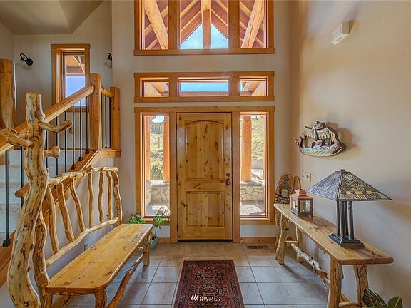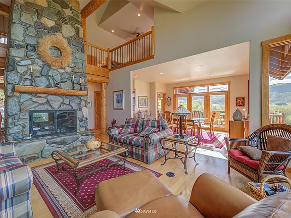 5 sun drenched acres, scattered pines, lush vegetation and abundant wildflowers. Driveway is lined by breathtaking scenery leading to lodge perched meticulously for expansive views, tranquility, and seclusion. Grand entrance showcases centerpiece majestic floor to ceiling river rock fireplace. Sunlit great room has soaring ceilings and walls of glass. Ample entertainment space in the oversized kitchen. Full dinning room and deck for seamless enjoyment. Exceptional floor plan and quality. Primary suite has cathedral ceiling and sumptuous bath. Many flex rooms for home office or endless possibilities. Attached 3 car garage. Rare find next to vast Moccasin Lake Ranch. Enjoy Sun Mountain and downtown Winthrop all very close to stellar location