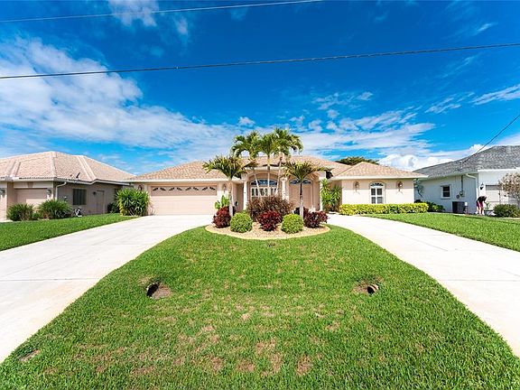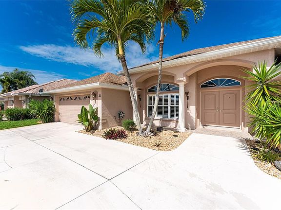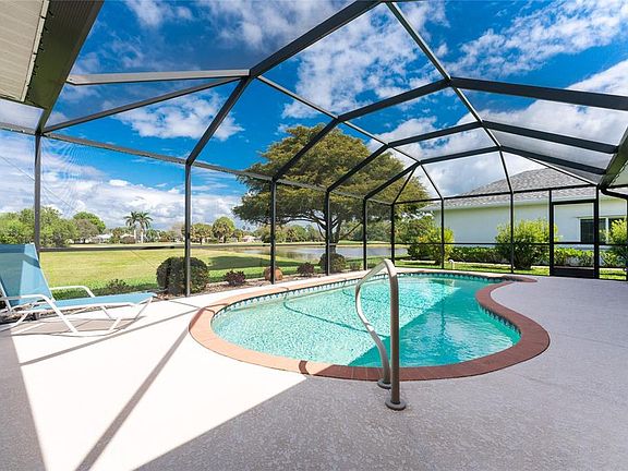This Showcase Golf Course Pool Home, located in the Premier Golfing Community of Rotonda West, is the true definition of the Florida Lifestyle. Situated on a home site with spectacular golf course and water views, the meticulous tropical landscaping, circular driveway, elegant columns, palladium windows, and 2021 roof set the precedent for the unparalleled quality of this split bedroom floorplan home. Stepping through the double front doors, pocketing sliding glass doors frame your unparalleled golf course and water views just past the sparkling heated pool and screened lanai. Inside, beautiful terra cotta tile flooring offers easy maintenance, the stunning lighting fixtures, upgraded ceiling fans, plantation shutters, and unique architectural features add a distinctive flair, and the soaring vaulted and tray ceilings and multiple windows add volume and an energizing flow of natural light. The gourmet kitchen offers many upgrades, including gleaming granite counters accented by an attractive tile backsplash, beautiful wood cabinets, a breakfast bar, and it opens to the breakfast nook, Great room, and lanai, perfect for entertaining! Wake to views of your lanai through sliders in the Master Bedroom and have a quiet cup of coffee in the breakfast nook, enjoying Golf Course views through your mitered aquarium picture windows as you plan your day. The garage workbench is the perfect place to finish your projects. Then spend the day golfing at one of the 5 community courses, lounge on a nearby sandy white beach, or go boating in the ICW and Gulf of Mexico. You are minutes from Englewood and Boca Grande beaches, marinas, shopping, restaurants, and of course, golfing. In the evening, rinse off the sand from the beach or sand traps, have dinner with your neighbors at one of the community clubhouses, or fire up the grill, float in the pool that was added in 2013, and use the pool bath to keep your floors dry. The 2018 HVAC system and well for irrigation are icing on the cake. This will not last, call today!