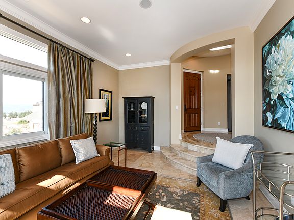 The property boasts three separate living spaces, enhanced by multiple fireplaces that create a cozy atmosphere. A wet bar complete with a wine fridge makes entertaining effortless.