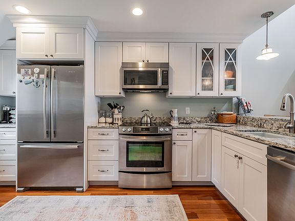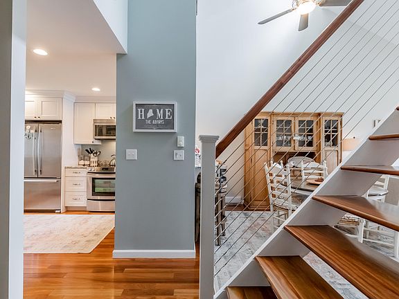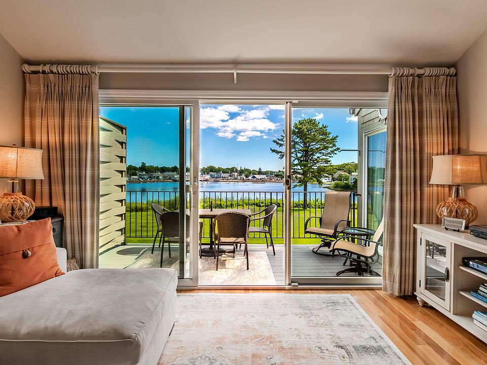 Tucked away on a quiet cul-de-sac with front row views looking out to the Kennebunk River and the bustling activity in the ''Port'', the ''Golden Ball'' unit was named after the schooner ''Golden Ball'' built in the David Clark Shipyard on the Kennebunk River and launched in 1890. This tastefully updated 3 BR, 3 BA condo unit is move in ready with its beautiful hardwood floors on the main level, open kitchen with quartz counters, stainless JennAir appliances, and good-sized pantry for extra storage, which flows into the living/dining area, perfect for entertaining. The wood burning fireplace will take the chill out of the air on those cool mornings. Mini-splits offer very efficient heating and cooling for those hot summer days. You won't be able to take your eyes off the lovely view from within or on the outside deck any time of year including the best view for the Christmas Prelude fireworks. Also on the main level is a large primary bedroom with wonderful river views and full bath. A second bedroom, full bath and laundry complete the main level.