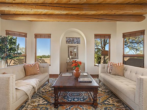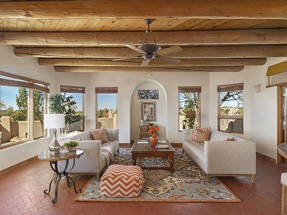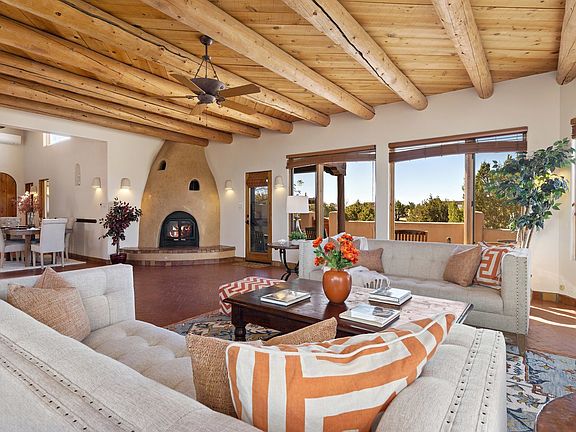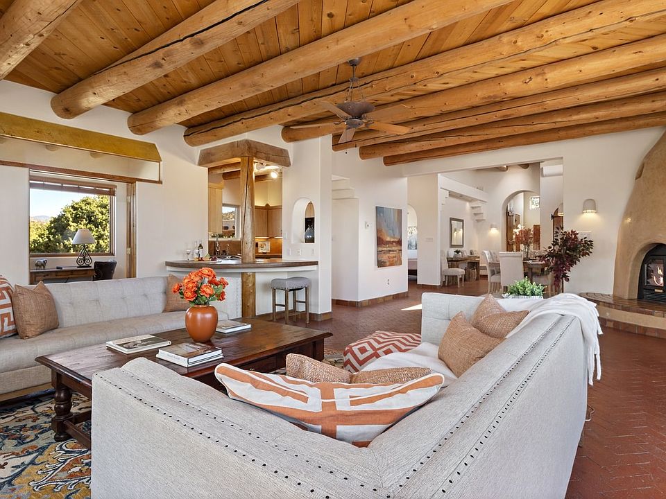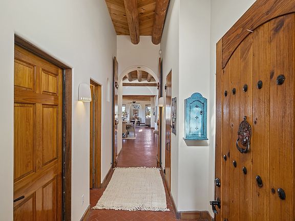 The most beautiful home Leif Backe ever built. A spectacular gallery hallway with 10 ft custom doors, welcome you into the dramatic great room with 18 ft. ceilings and substantial kiva fireplace. This one-of-a-kind home is designed for entertaining with kitchen open to great room and three outdoor areas from which to choose. Sunset and mountain views from the two walled courtyards. Luxurious generous master has gas fireplace, large walk in closet and banco seating. Detached 300 sq. ft. studio has a full bath, saltillo tile and sliding doors to its own large covered portal. The only home Leif Backe built with a tiled Native American Heartline at the front door. Very versatile floorplan could be 4 or 5 bedrooms, or 3 bedrooms with two office spaces. An additional space next to the kitchen has been kids art room or office/studio space. Two mini-splits provide air conditioning and heat - one is main house and the other in the studio. Brick and tile floors throughout. Brai roof with silicone coating. Tankless hot water. Radiant in-floor heat and on the Eldorado Community Water System. Only one small step in the master.