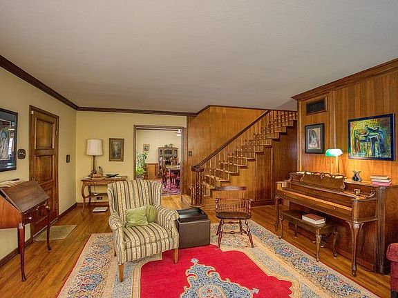 EXQUISITE WOOD INTERIOR. Designed by renowned Texas architect Ted Maffitt, the house incorporates unique wood paneling and detail using wood originally designated for luxury Pullman cars. The house was built by Wayne E. Carter, a former railroad engineer and cabinetmaker who used the exquisite wood details throughout the house, including the staircase, living room walls, library bookcases and doors. He did much of the interior work himself - building the cabinets, carving the staircase, and putting in the 3/8" paneling. He had collected the wood for years and took great pride in his workmanship. He crafted the fine wood floors, stained molding and solid doors - made to match each room - throughout the house. The library also adjoins the terrace through stained-glass doors. The house is built on a slope and has 3 levels. This 4 bedroom home, with a raised curved terrace overlooking a huge backyard (nearly 1-acre), is perfect for a growing family. HUGE YARD. CORNER LOT. YOU WILL FEEL RIGHT AT HOME.