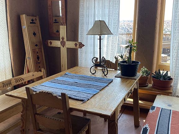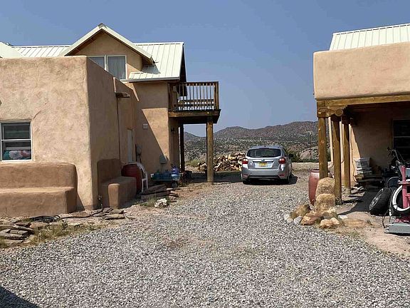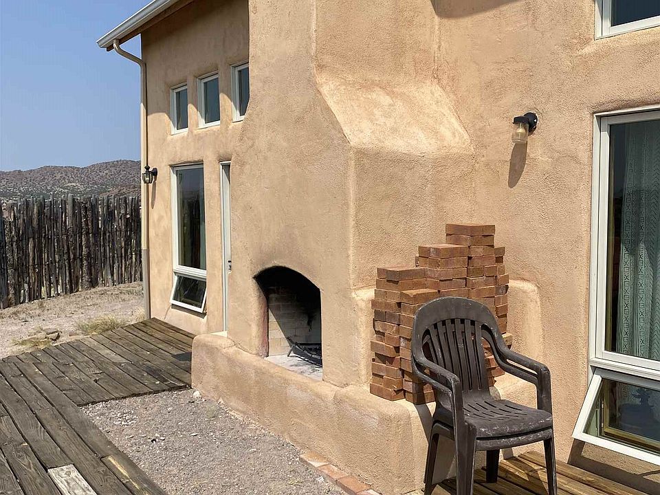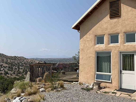 An artistic Northern New Mexico style home perched above the village of Ojo Caliente. From the deck, enjoy the views of Pedernal, the Jemez and the Sangre de Cristo Mountains while sitting by the outdoor fireplace. The home has custom carved wood features, flagstone counter tops, lots of natural light that frame the magnificent views. An energy efficient, open concept, earthy home with an extra living/ work space just out the front door! There is a living unit complete with a compact kitchenette, a bathroom, an attic space and a work space with a garage door for accessing supplies. There is also a bedroom above the outdoor staircase. Many possibilities and configurations for this property!