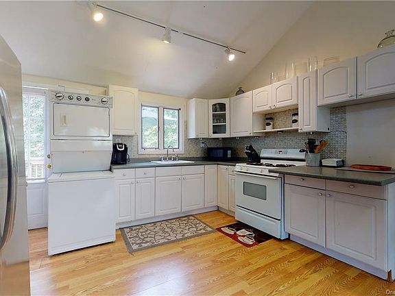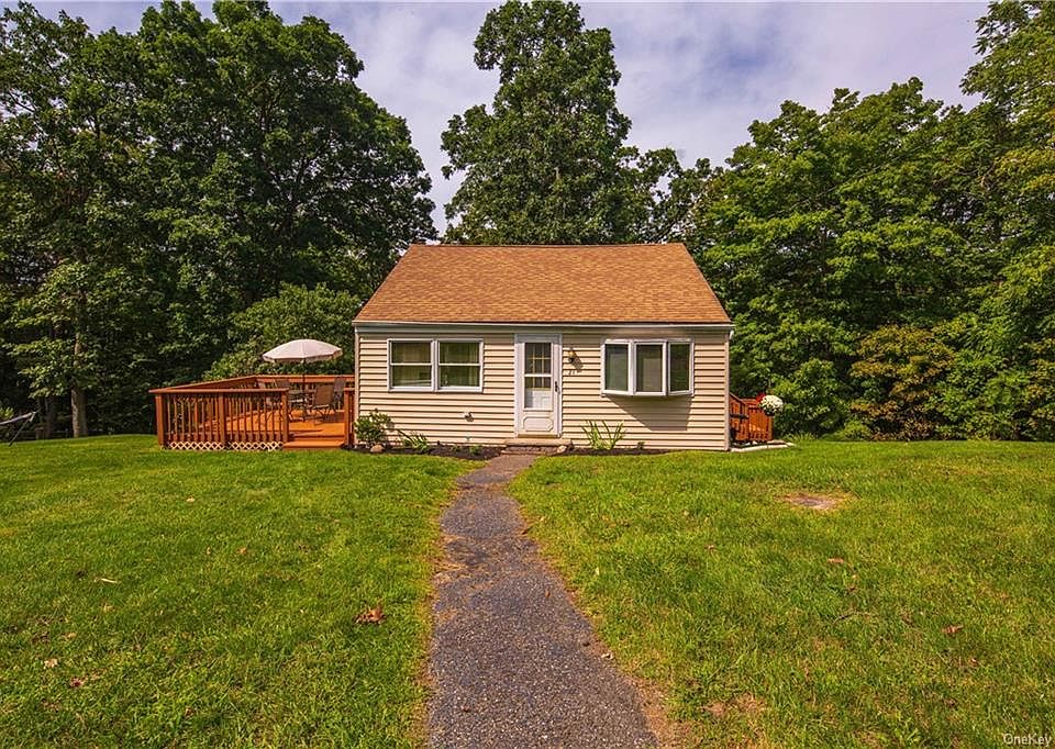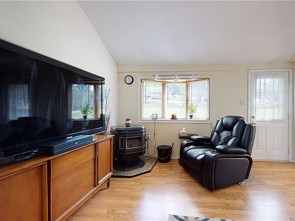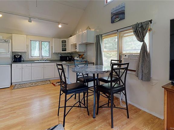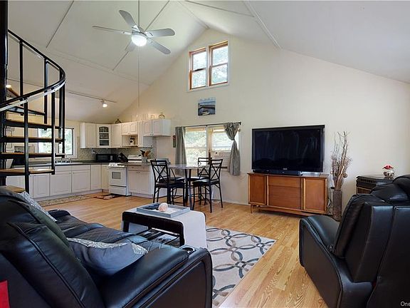 Welcome to 21 Ridge Road located on private road on over 1 acre of property in Continental Village that offers amenties such as playground, lake/beach use, clubhouse, tennis courts, basketball court and included in your taxes. This charming cottage is 1 bedroom that lives like 2. Open floor plan with vaulted ceilings welcomes you into a living room with pellet stove, Eat in Kitchen, stackable washer and dryer. 1 Bedroom and additional living space that is currently being used as an office. This can also be converted into a dining room with sliding doors that leads you to a side deck to enjoy. Spiral staircase takes you to a loft area that can be used as storage. Step outside from the kitchen door and find another deck to bbq on with complete privacy. Take the stairs down and you will find basement entrance for more storage. Star is $1967.