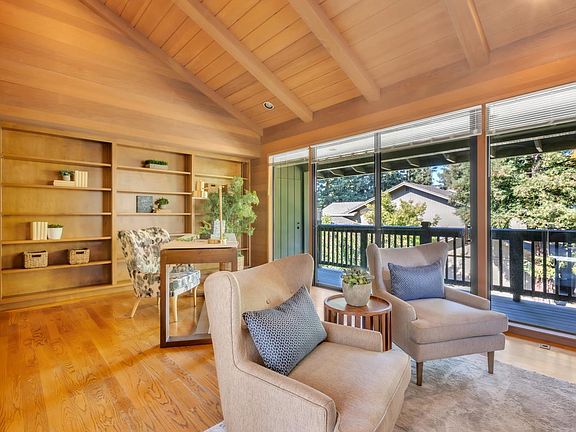 Premier bluff lot in Carmichael's prestigious Riverwood community. This custom home was built by Lewis and Bristow complete with soaring ceilings, hardwood floors and a unique design to allow light. There are two large bedrooms each with ensuite bathrooms. The main living area is upstairs and includes a large kitchen, dining room, living room and an office area with expansive bookcases that could be used as an additional bedroom. The full upstairs bathroom is bathed in Italian tile. Up the spiral staircase is a large loft area. The back decks have recently been replaced and painted. The house was home to the original owners and is situated near the upper pool. The finished garage was designed hold three cars and work area.