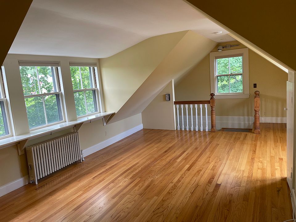 3rd floor living room., 1 bedroom, an office, bathroom with tub/shower. Lots of storage. Hardwood floors and new wall-to-wall carpeting.