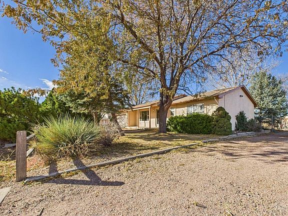 Escape the ordinary and discover this private sanctuary tucked away on a secluded lot in Pueblo West. Set off the beaten path and surrounded by mature trees, this home offers true privacy and a calming connection to nature. Inside, you're greeted with a warm, inviting atmosphere featuring three spacious bedrooms and two 3/4 bathrooms. Custom wooden doors and trim add rustic elegance throughout the main living areas, while vaulted ceilings create an airy, open feel. The bright living room flows seamlessly into the kitchen, where hardwood floors and a functional island with an electric stove make cooking and entertaining effortless. The adjoining dining area opens directly to the covered back patio, perfect for indoor-outdoor living and enjoying peaceful backyard views. The guest bathroom features a beautiful tile-inlaid walk-in shower, adding a touch of luxury. A cozy family room with a functional wood stove provides the ideal space for relaxing on cool evenings. The full unfinished basement offers endless possibilities for future expansion or storage. A two-year-old water heater ensures added peace of mind. Outside, a welcoming covered front porch is perfect for morning coffee, while mature trees enhance both privacy and scenery. The property also includes a 2-car attached garage, two storage sheds, and a dedicated dog enclosure. This unique Pueblo West retreat blends seclusion, rustic charm, and modern comfort—schedule your showing today!