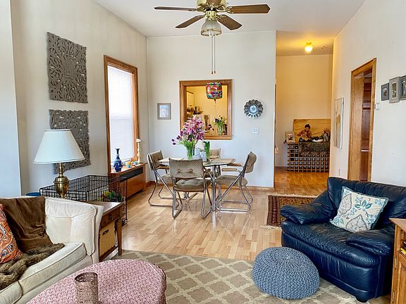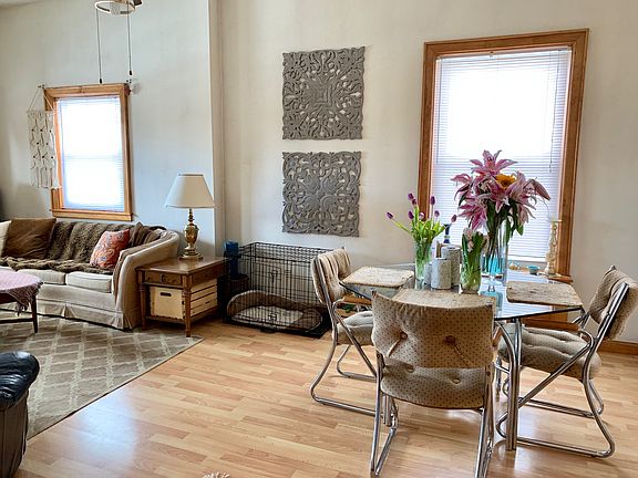 High ceilings throughout the unit, tasteful custom woodwork radiator covers and mini blinds on all windows.