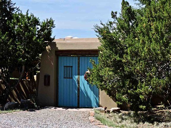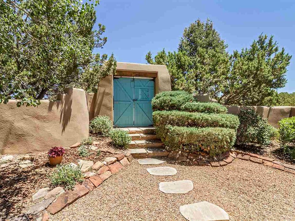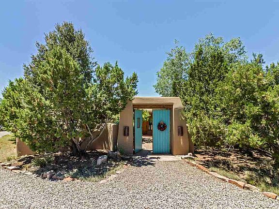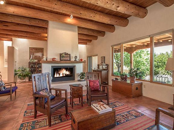 Beautiful artistic home with over 2800 sq.ft. in the Ladera area of Eldorado. Bordering a greenbelt next to the state land this lovely dramatic residence delights the eye in every direction. Through double gates one enters the front landscaped courtyard. A massive front door opens to mountain views through a grand great room with lofty viga ceilings and gleaming diamond plastered walls. There is an impressive double sided gas fireplace dividing the dining room and great room. Gallery hallway ideal for displaying your art links the large master bedroom suite on the east side to the west guest bedrooms and bath. A powder room for guests convenient to the living areas. The spacious well appointed kitchen flows to a sunny cozy breakfast nook/den with a kiva fireplace. Fabulously famous mountain sunset views from the southwesterly portal and walled lush gardens will delight you and your guests as you enjoy the peaceful surroundings. This home is a must see!