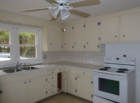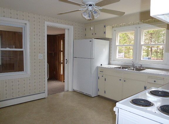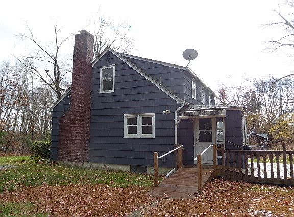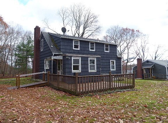 This three bedroom cape is over 1300 square feet with full dormer. It has an eat in kitchen, formal dining room or possible fourth bedroom and one and a half baths. Living room has a fireplace and picture window. House is heated with oil hot water baseboard heat. Exterior is wood siding and has a good size deck off back. House sits on almost half an acre in a country setting.,