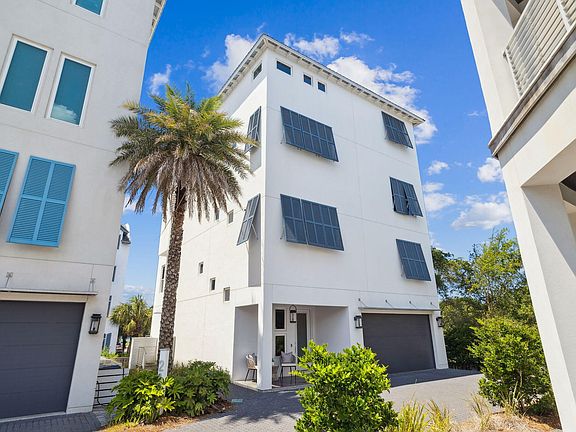 This luxurious home is located south of 30A at Caspian Estates in a corner lot with forever Gulf views. The neighborhood has nine homes with 2 private entry gates and a pool. This 4,858 sq ft home has 5 bedrooms, 5 full baths, and 3 half baths. The house has a 2-car garage and front porch sitting area both with exterior gas lanterns. House has a custom millwork staircase with gorgeous chandeliers and 4 floor accessible elevator.The first floor includes an entry foyer, staging area, humidity-controlled wine cave, oversized laundry room with washer/dryer, storage closet, half bath, bar with sink/refrigerator/ice maker, and guest bedroom with king-sized bed, full bath & double closets. The laundry room opens to an exterior walkway with access to an outdoor shower with hot & cold water. The second floor includes a guest suite with full bath, laundry closet with washer/dryer, and primary suite. The guest suite includes a "swinging" king bed & two custom wall mount bunk twin beds, bathroom with double sinks and soaking tub & shower, and walk-in closet. The double-door entry to the primary suite has a feature wall behind king-size Tempur-Pedic bed with dual controls, built-in cabinets, morning bar with refrigerator, and wall-mounted television. The master bath includes a spa bath with a freestanding tub and double head shower with Kohler audio system, double sinks, Bidet toilet, and walk-in closet with vanity table, lighted mirror & sink. The primary suite leads out to a private covered 2nd floor porch with forever Gulf views from the swinging bed.