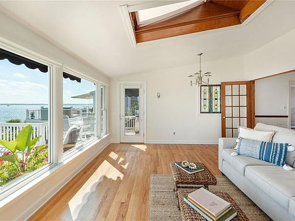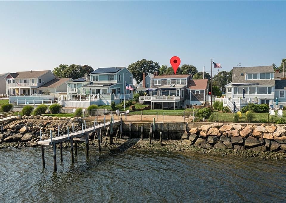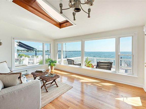 Waterfront with a dock on Narragansett Terrace! Enjoy spectacular sunsets and sunrises from this special property in a coveted location that is situated perfectly to offer expansive views of the Bay and both the Newport and Jamestown bridges. Step over the threshold into a charming home ready to move in or with potential for updates to make it your own. The kitchen offers granite counter tops and opens to a large family room with picture windows framing the boats sailing by. The first floor also features a 1/2 bath, a formal dining room and large living room with a fireplace that flows to a perfect space for an office or additional dining with a view. The large deck awaits you on a summer evening to grill and view the boating activity beyond. Upstairs are three bedrooms and a full bath. The lower level offers additional living space and more views with a walkout level with the patio under the deck. The yard flows to a patio and a dock giving you even more access to the water. This storybook cape is ready for its next owner. An offering not to be missed!