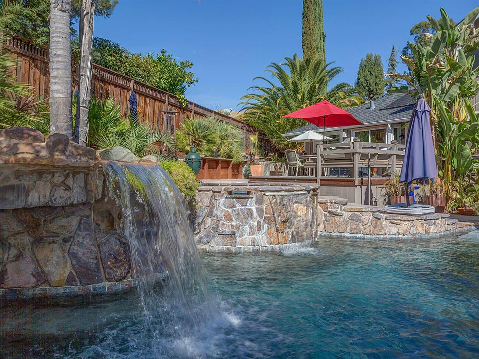 COME HOME TO YOUR OWN PRIVATE PARADISE. Nestled on a cul-de-sac in the coveted Saddle Ridge Neighborhood this 4 Bedroom, 3 Bathroom home represents the absolute BEST of indoor/outdoor living. Spacious tri-level floor plan with large master suite; large living room; separate dining room. The eat-in kitchen sparkles w/quartz countertops; a movable island; new Bosch refrigerator and Miele D/W. New luxurious European hardwood floors throughout the home; remodeled/updated concrete fireplace w/rustic wood mantle finish makes for a comfy/cozy family room which has a wet bar & direct access to the backyard. Lower level has the 4th bedroom (or office) and full bathroom. This is an outdoors entertainment area to dream about. Palms and other greenery create an island resort ambience. The centerpiece is the solar heated lagoon-like saltwater pool with an Acapulco shelf, swim-up grotto, cascading waterfall and spillover spa. There’s even a custom Koi Pond with beautiful stonework & back lighting. Minutes to shopping, dining, Paso Nogal Dog Park, biking/Hiking Trails.