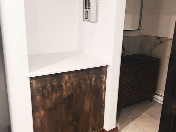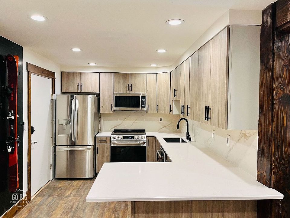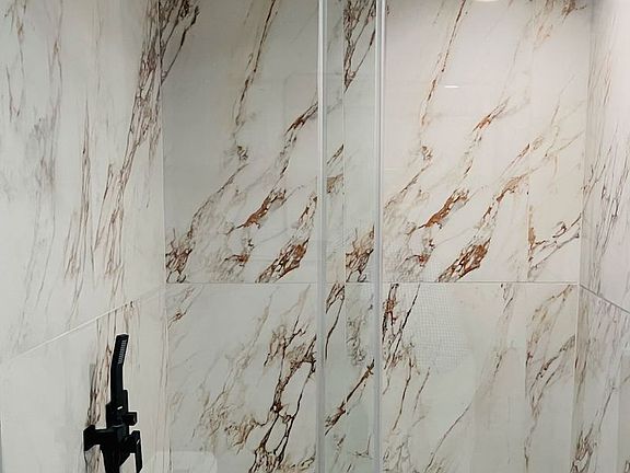 This newly renovated studio features a marble-tiled walk-in shower with black fixtures, a modern kitchen with high-end stainless steel appliances! The living area offers rich wood flooring, rustic wooden beams, and bright recessed lighting, combining comfort and style.