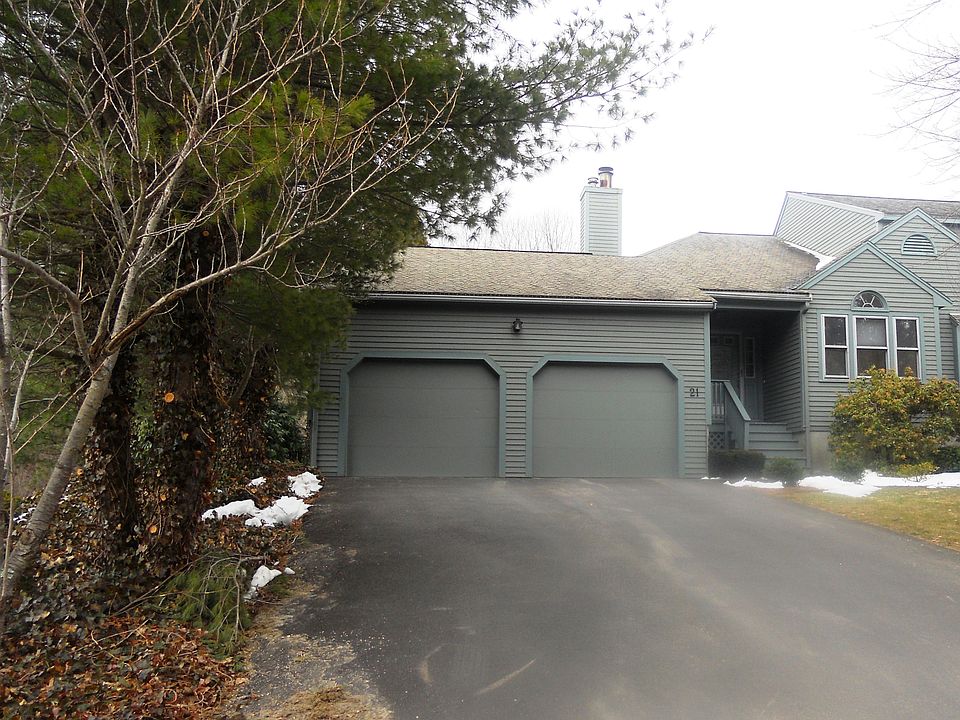 SINGLE-LEVEL, maintenance-free living at its finest! Rare, sought-after RANCH STYLE END UNIT at Spruce Pond Village. NEW Flooring, NEW Furnace, NEW H2O Heater, freshly painted throughout. Sunny, spacious Open Floor Plan Dining Room/Living Room with Cathedral Ceiling, Skylights, Fireplace, Sliders to Composite Deck. Large Kitchen with granite Counters and Breakfast Area. 2-CAR ATTACHED GARAGE. Huge WALK-OUT Basement waiting to be finished. Unit abuts woods. Great commuter location. HURRY - START PACKING!