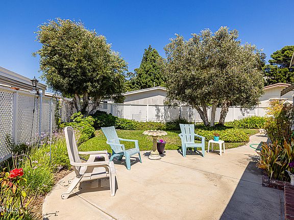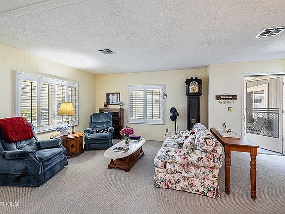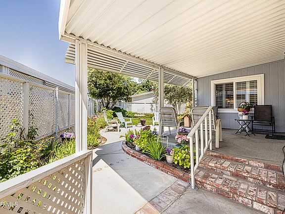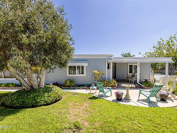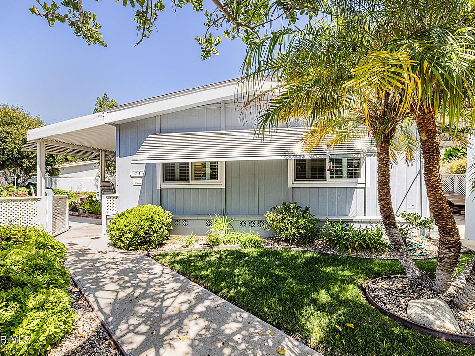 Something Special!!! Situated in the beautiful city of Camarillo and in the wonderful 55+ community of Rancho Adolfo Estate is this expanded 2 bedroom, 2 bath PLUS added bonus room/office home where you own the land!! This RARE find is at the end of a cul-de-sac street, near ample guest parking, offers an expansive driveway and carport that could fit 4/5 cars possibly, a 17x17 storage shed and an absolutely stunning front yard with manicured lawn, flowerbeds, shade trees and a charming sitting porch. Home has fully paid and energy saving solar panels, dual pane windows throughout, plantation shutters, and central air & heat for your comfort. A bright & open floor plan welcomes you with a comfortable living room and dining area, a bright kitchen with updated cabinets with pull-outs and tons of counter space, plus a large bonus room that is perfect for use as a den, office, home gym and more. The primary bedroom has a private en suite full bathroom and a mirrored wardrobe closet with organizer. Secondary bedroom and bath are ample sized, plus there is an indoor laundry room. This amazing community offers its active residents its own pitch & putt golf course, pool, spa, sauna, clubhouse, billiards, gym, RV parking area and much more. Near shopping, dining, parks, and schools, this home offers the perfect blend of comfort, convenience, and tranquility. Camarillo's amazing, year-round weather combined with real land ownership and low monthly HOA fees make this the perfect Southern California retirement location.
