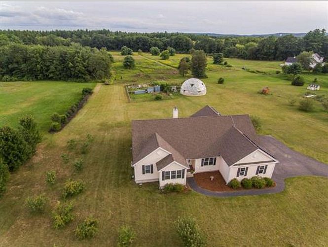 A BEAUTIFUL HOME IN A PEACEFUL SETTING FOR SOMEONE SEEKING SELF SUFFICIENCY & A HEALTHY LIFESTYLE! This 2840 sf open-concept ranch is beautifully set on 6.4 acres of rolling lawn & organic farmland w/ beach frontage on Souhegan River. Large eat-in kitchen has gorgeous cherry cabinets, stainless appliances, a walk-in pantry & a large island. Large living room has 11-ft ceilings, a propane FP w/an elegant marble hearth. A wall of tall windows allows for an unobstructed view over grazing pasture land. 9 ft ceilings & hardwood floors. Solar panels saves money each month. Oversized 3 car garage has a basement access. This 1st floor office can also be a 4th bedroom. A 2nd floor 440 SF bonus room can also be a 4th bedroom or Man Cave. Nice MasterBR & Bath. Lots of closets/storage. The 2400 sf basement has ample storage & finishing possibilities. Outside is equally impressive. The front yard is an apple orchard w/40+ trees. The 1200 SF geodesic dome/greenhouse (once featured in the Union Leader) allows for year-round gardening &contains a large aquaponics system (minimal upkeep). Waist-high grow beds make gardening a pleasure. Remainder includes: A smart pen design, 3 coops for chickens and ducks, Peach trees, a large garden for growing your own organic food, 3 Warre beehives, electrified fenced in acres (to raise grass fed cows, sheep or horses.) & a secluded beach with 198' of river frontage for swimming and boating! It takes less than 20 mins/day to keep farm going.