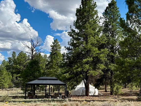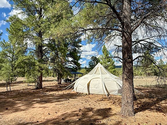 Bring your horses and camp under the stars! This property is fully fenced, with 200 amp electric and RV hookup set back from the road in the tall ponderosa pines. The long driveway crosses a small arroyo to a well-equipped camping area including a 12x16 metal gazebo with grill, seating, rain catchment, and solar lighting. Take camping to the next level in a 300sf stargazing tent with lighting and stove vent. A second large fenced area runs along the east side of the property, perfect for horses. 10x12 storage shed, good wells in the area. Timberlake Ranch is a friendly community with a volunteer fire department less than half a mile away. HOA dues are only $230/yr, roads are maintained year-round.