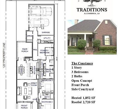Discover The Constance in Traditions on the Bayou, a premier 75-acre gated Traditional Neighborhood Development in central Louisiana. Designed for walkability and connection, this vibrant community offers sidewalks, parks, trails, a community pool, pavilion, and future retail, dining, and office spaces. The Constance is a beautifully crafted 1-story home with an open-concept design, a welcoming front porch, and a private side courtyard. It features 3 bedrooms and 2 baths, with 1,852 heated square feet (2,720 SF under roof) and a floor plan that perfectly balances comfort and style. Residents enjoy exclusive amenities and community events like farmers' markets, concerts, and holiday gatherings.