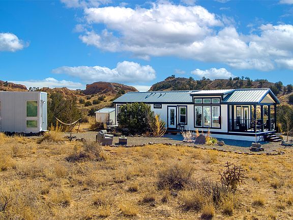 Tucked away at the end of a private, gated road, this turnkey, charming, and modern off-grid manufactured home offers the perfect blend of comfort and sustainability. Situated on over 10 pristine acres and nestled near the base of Sierra Negra, enjoy breathtaking views of red sandstone cliffs and the Jemez Mountains. This bright, light-filled home is newly built and placed on a permanent foundation in 2022. Enjoy high ceilings and a modern kitchen in this thoughtfully designed home with a pitched pro-panel roof and forced air heating and cooling for year-round comfort. The detached studio/guesthouse with a mini-split system provides the perfect space for guests, a home office, or creative pursuits.