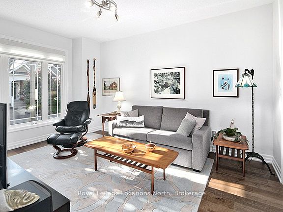Welcome to Waterside Lane, an elegant enclave within The Shipyards community one of Collingwood's most sought-after locations for those who want to live steps from everything this vibrant town has to offer. This raised bungalow offers the perfect blend of comfort, style, and convenience ideal for a full-time residence or a part-time retreat. Just a short stroll to downtown Collingwood, the harbourfront, waterfront parks, the Georgian Trail, and the Collingwood Pier, this home places you at the heart of it all. Enjoy the ease of walking to your favourite restaurants, shops, cafés, and entertainment venues, while returning home to a peaceful, private setting surrounded by beautifully maintained grounds. Inside, the home offers over 1600 sq. ft. of light-filled living space. The open-concept living and dining area features a soaring vaulted ceiling and a cozy gas fireplace, creating a warm and inviting space for relaxing or entertaining. There is plenty of room with a primary bedroom with ensuite and guest bedroom/den and second bathroom. The kitchen offers ample custom cabinetry, stone counters, a bank of pantries and lots of space for entertaining and easy access to the rear garden and patio perfect for morning coffee or evening gatherings. The partially finished lower level extends your living space, featuring a comfortable family room, large hobby room, workshop, and ample storage with potential for further finishing if desired. Outside, you will appreciate the extra-roomy patio, and private rear yard, rare features in a downtown Collingwood location. The attached garage provides inside entry and added convenience for year-round living. Experience the best of Collingwood's waterfront lifestyle from waterfront sunsets to boutique shopping and fine dining. This beautiful Waterside Lane home offers the perfect blend of Collingwood charm and modern comfort, in a setting that truly captures the spirit of living by the bay.