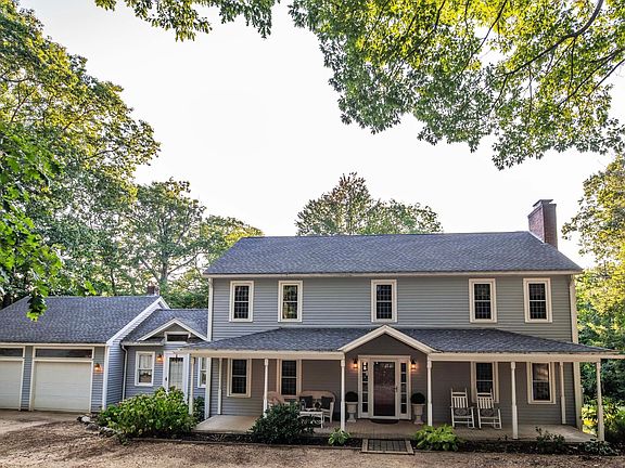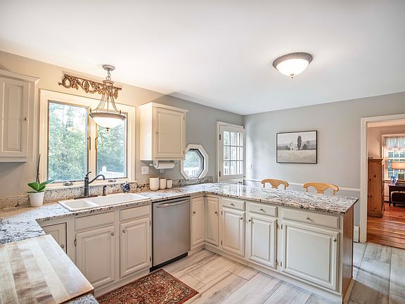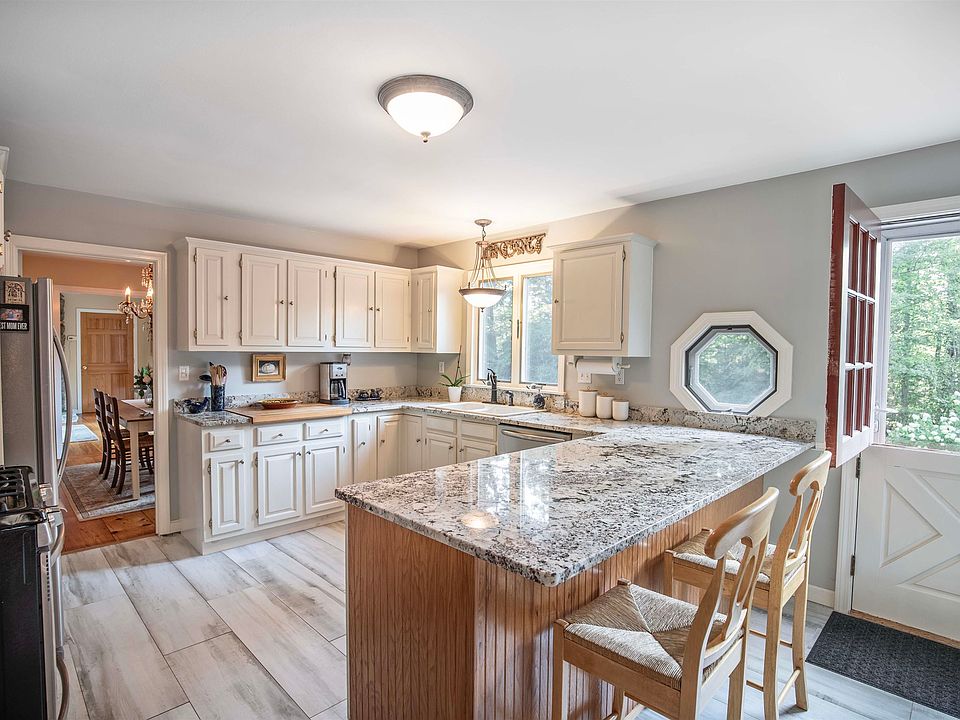 Welcome to your dream home in the heart of historic Wilton Center, where privacy and modern comfort meet. Set on a serene 1.5-acre lot, this beautifully maintained 4-bed, 2.5-bath colonial farmhouse combines modern upgrades with timeless New England charm. Recent improvements, including a brand-new roof, Harvey windows, hot water tank, 500-gal propane tank, and generator hookup, make this home truly move-in ready. Wind down the circular drive and arrive at the inviting covered front porch. Step into a stunningly renovated kitchen featuring ceramic tile flooring, granite counters, a porcelain sink, and stainless steel appliances, flowing seamlessly into a dedicated dining area. Step into the vaulted ceiling living room complete with a cozy pellet stove, set against a custom stone hearth crafted from Souhegan River rocks. Wide plank pine floors add character throughout the main level. Upstairs, the primary bedroom features a freshly updated en-suite bath with a dressing area and generously sized closets. Three additional bedrooms and a full bath complete the second floor. The walk-up attic and a walk-out basement provide extra storage and potential for future finished space. Step outside to an expansive deck, perfect for outdoor gatherings in your private backyard. Just a short drive to High Mowing and Pine Hill Schools, with easy access to shopping, dining, the Milford Oval, and the MA border. Enjoy privacy without sacrificing convenience-this home is ready to welcome you!