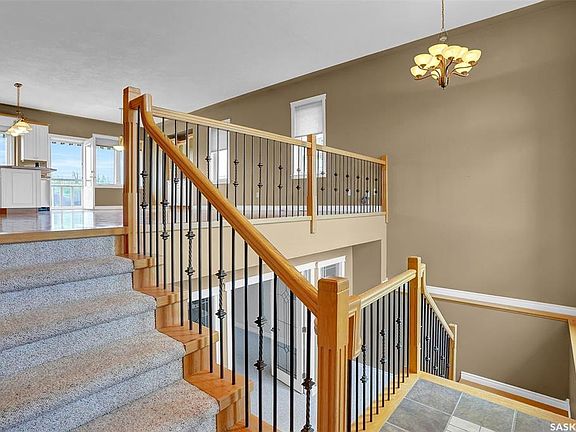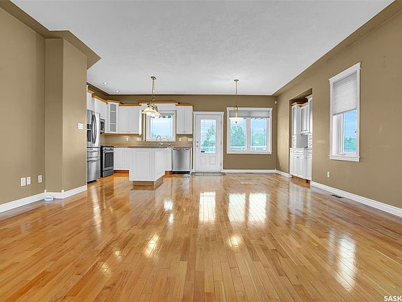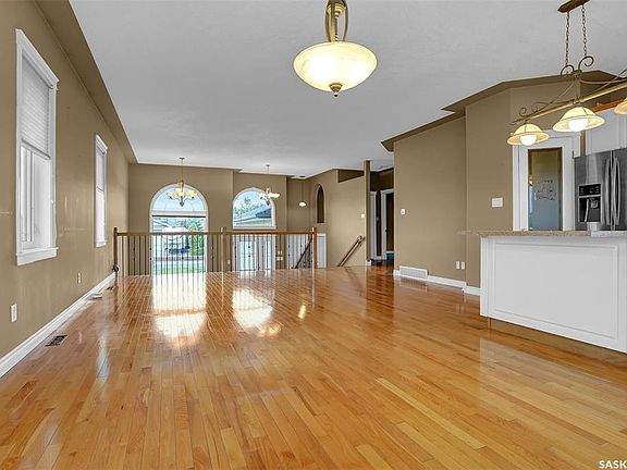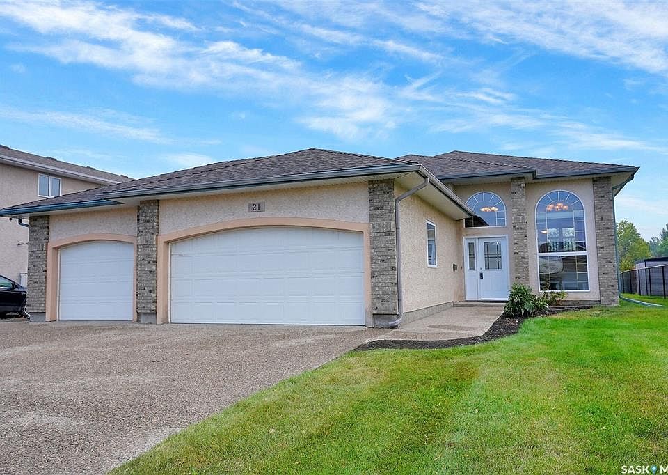Welcome to 21 Woods Crescent, backing the golf course in Emerald Park. Eye catching curb appeal. Generous size lot with oversized driveway and triple garage. Custom built 1478 sq.ft. bi-level sprawls across a large lot offering privacy and space. Spacious front foyer overlooks the main floor and open basement with french doors. Basement includes a rec room with gas fireplace, two extra bedrooms and a 3 piece bath Lots of natural light throughout. White island style kitchen, with hardwood floors, opens to the large deck with retractable awning. Garage has drive thru door to backyard. Underground sprinklers. Deck offers great view of the golf course.