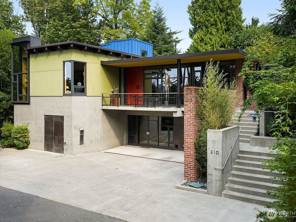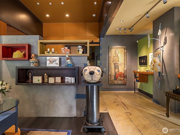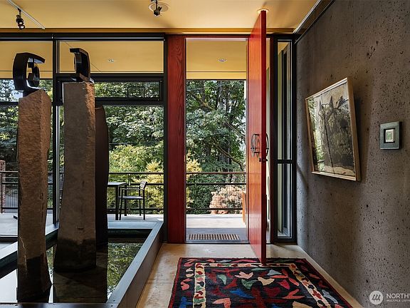 First time on market! Art and architecture coexist seamlessly in this exceptional custom designed contemporary home. A wall of glass and Julie Speidel water sculpture sets the tone upon entering. Hand-painted concrete floors, 14 ft ceiling with cold rolled steel accents, designer lighting, a fusion of texture & color throughout. Every surface is artisan crafted. Kitchen features rift-sawn cabinetry, high-end appliances, & opens to a private patio dappled in sunlight. Main floor primary bedroom includes a meditation alcove, fireplace, automated shades, a chic en-suite bathroom & large walk-in closet. Additional rooms provide opportunities for guests, home fitness, office, media room, or expanding your art collection. Lush & secluded setting!